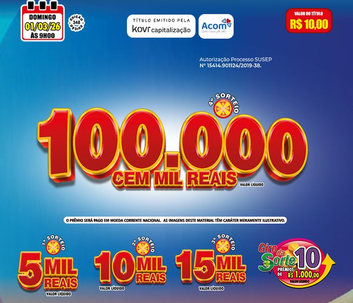 Sorteios decorrentes de Títulos de Capitalização de Pagamento Único, da Modalidade Filantropia Premiável, emitidos pela INVEST Capitalização S/A., inscrita no CNPJ sob nº 93.202.448/0001-79 e aprovados pela SUSEP. Você pode ajudar a ASSOCIAÇÃO DO COMBATE AO CÂNCER DO CENTRO-OESTE DE MINAS -ACOM comprando o Centro Oeste Cap e cedendo o direito de resgate. A aprovação deste Título pela SUSEP não implica, por parte da Autarquia, em incentivo ou recomendação a sua aquisição, representando exclusivamente, sua adequação às normas em vigor. Antes de contratar, consulte previamente as Condições Gerais.